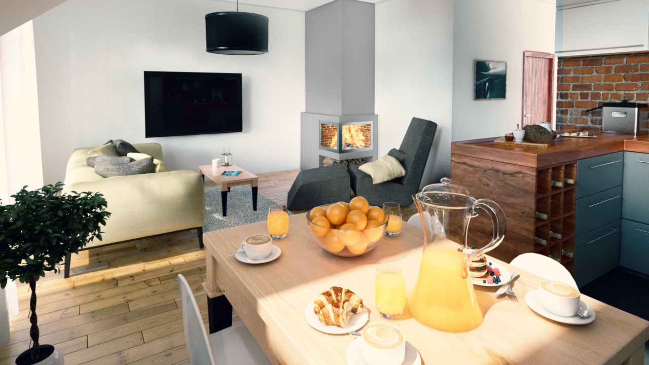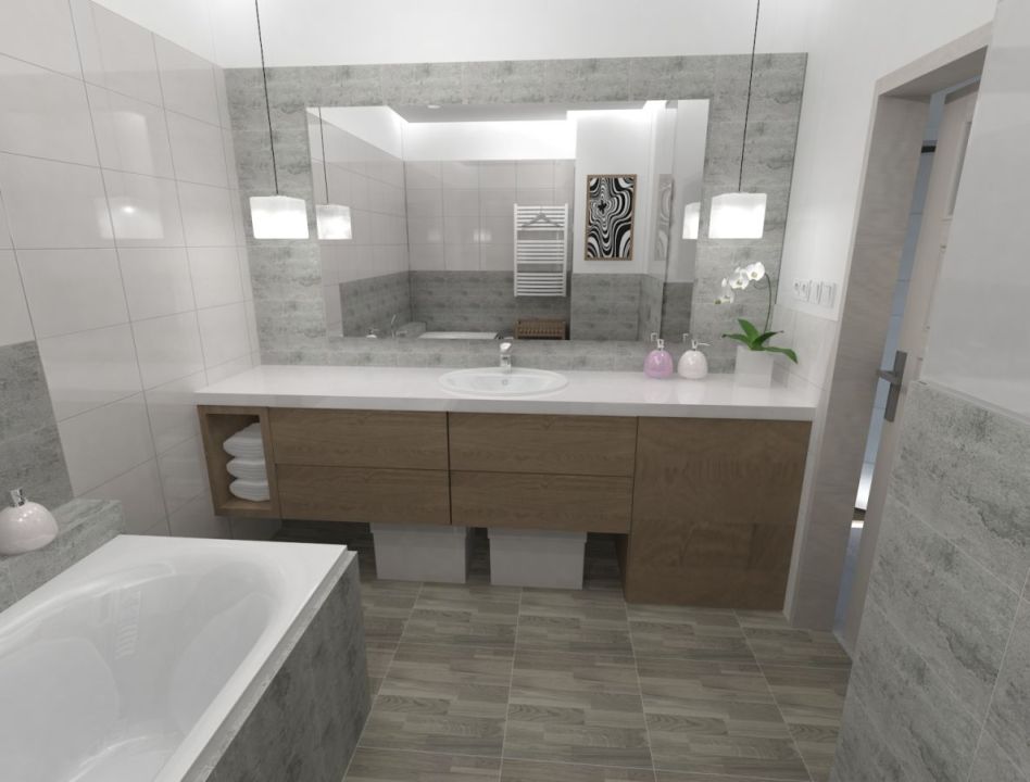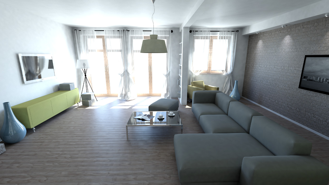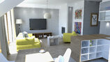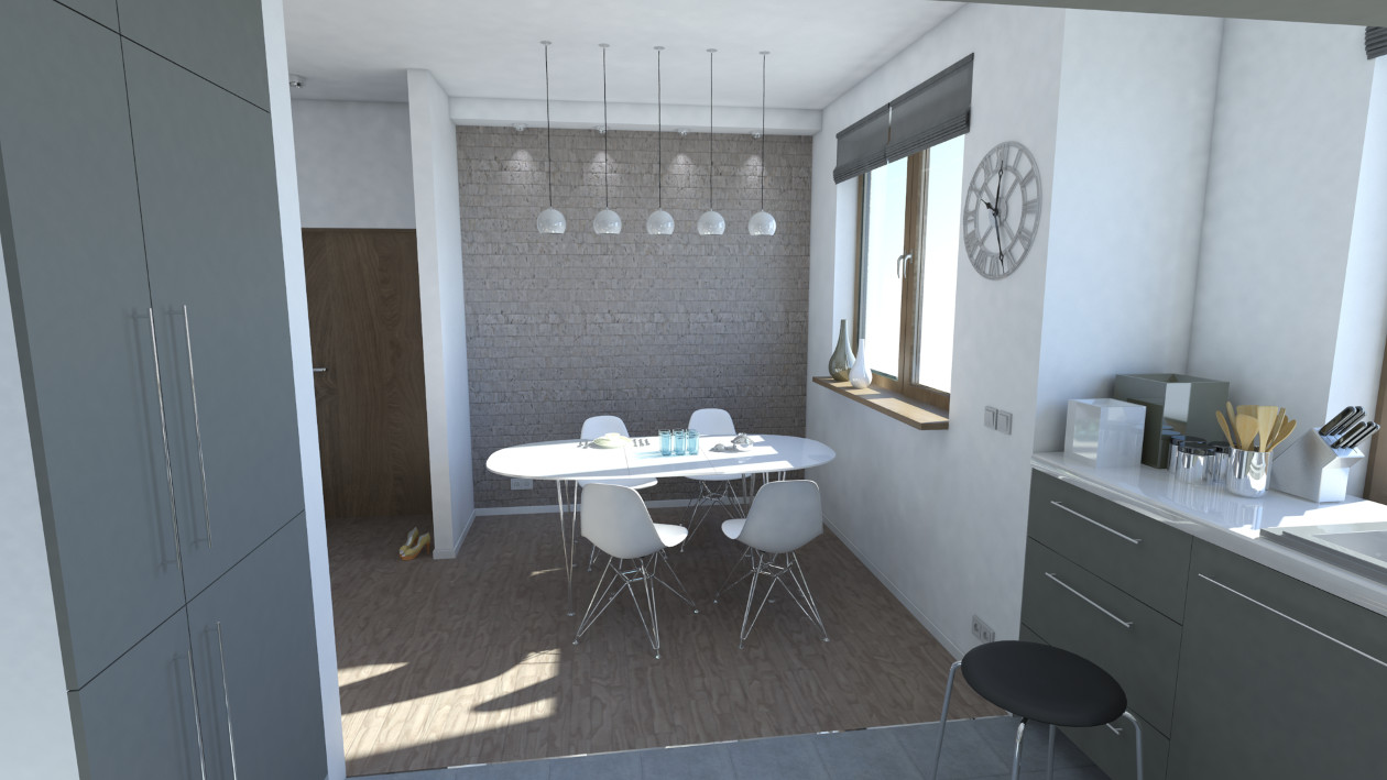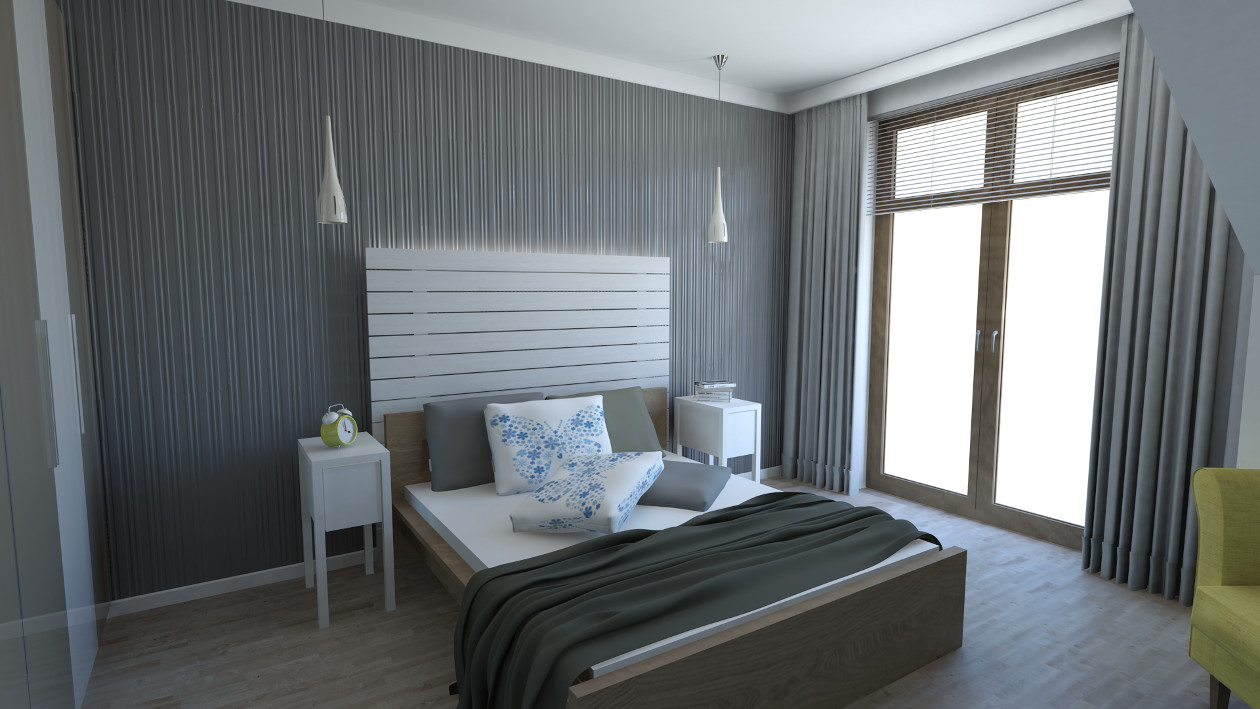 Zaprojektowane przez nas duże okna pozwolą cieszyć się widokiem przydomowej zieleni we własnym ogrodzie. W celu podniesienia funkcjonalności mieszkania zwiększyliśmy jego wysokość i przewidzieliśmy pomieszczenia pomocnicze: garderobę, spiżarnię oraz schowek.