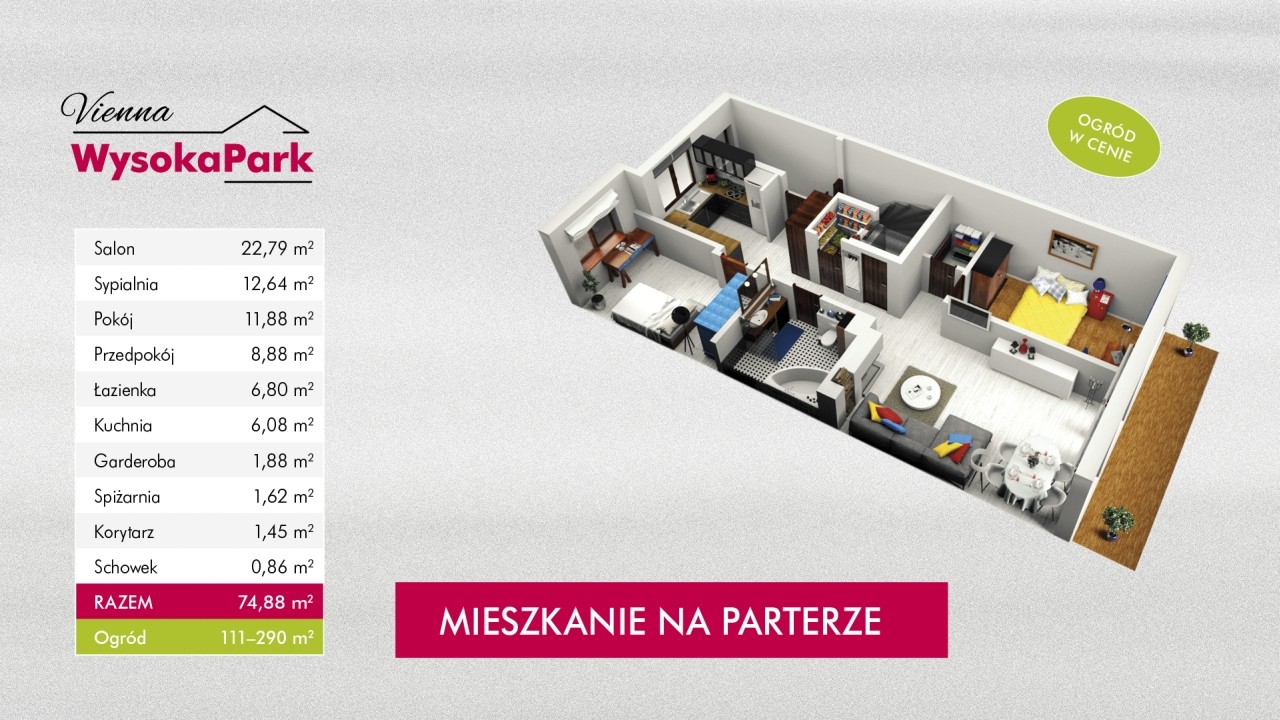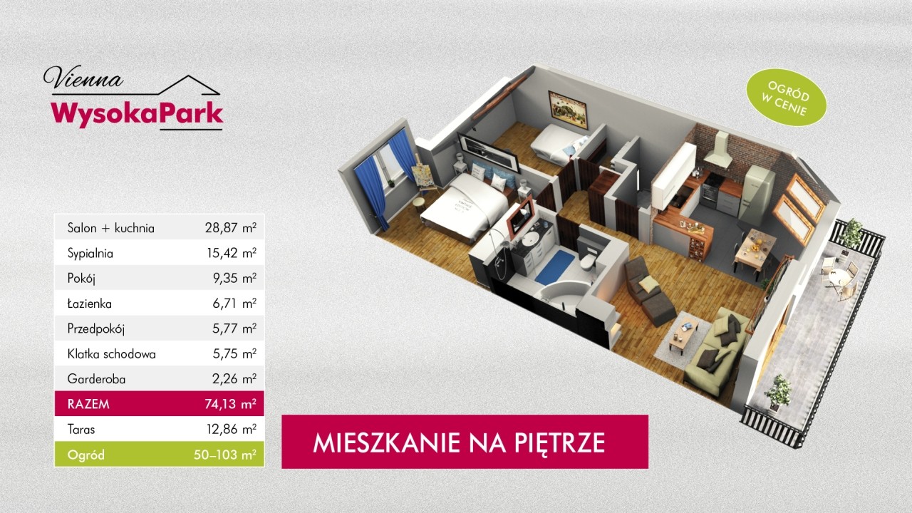 Osoby marzące o wypoczynku docenią duże okna oraz przestronny taras z widokiem na  starodrzew. Dla komfortu mieszkańców zwiększyliśmy wysokość mieszkania i przewidzieliśmy pomieszczenia pomocnicze: garderobę oraz strych.